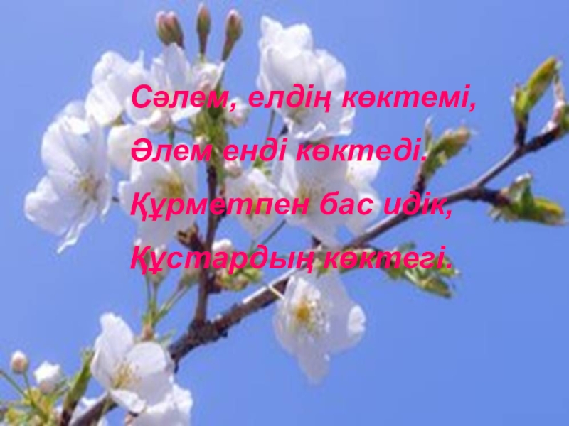 Сәлем, елдің көктемі,Әлем енді көктеді.Құрметпен бас идік,Құстардың көктегі.