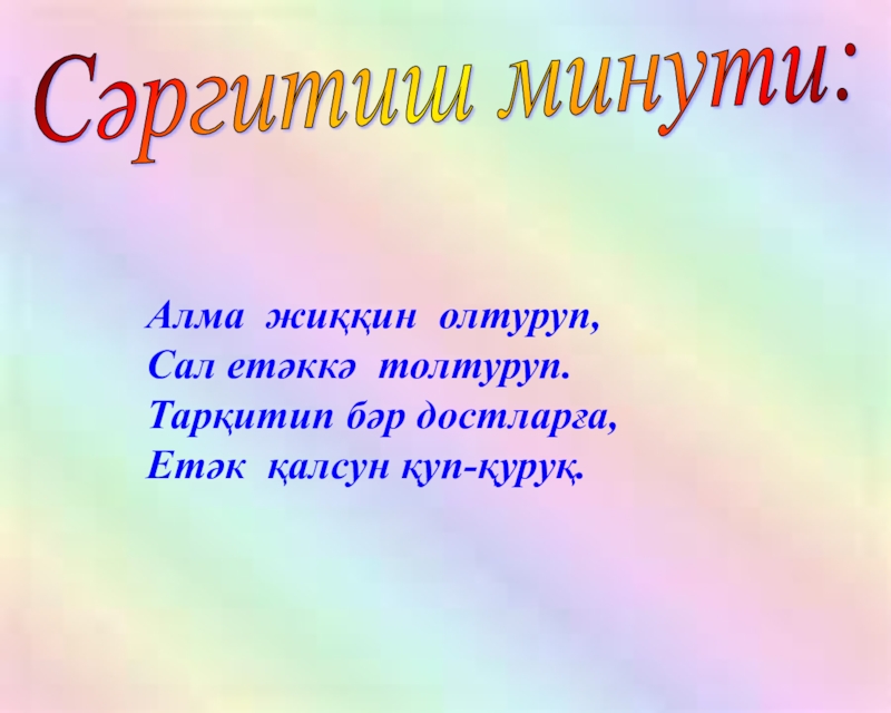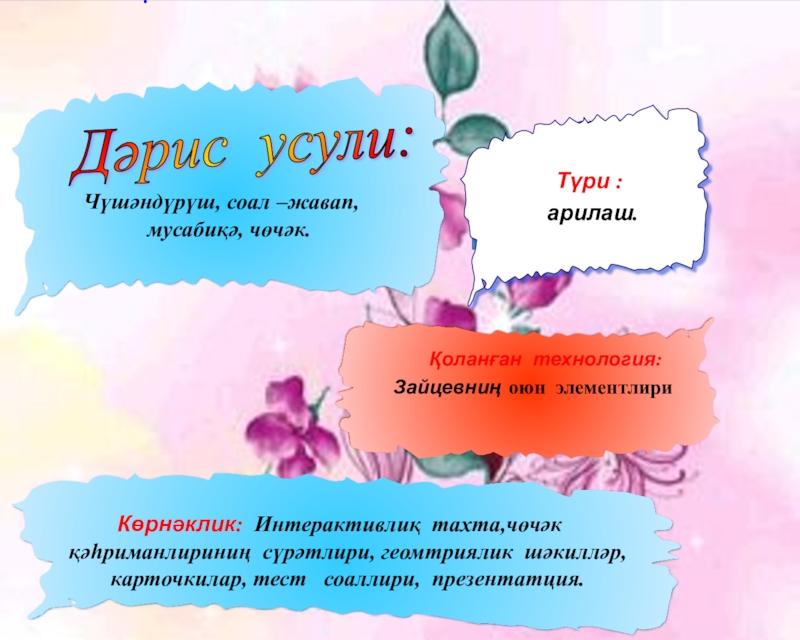 Көрнәклик: Интерактивлиқ тахта,чөчәк қәһриманлириниң сүрәтлири, геомтриялик шәкилләр, карточкилар, тест соаллири, презентатция.