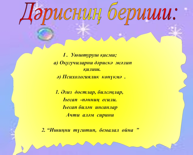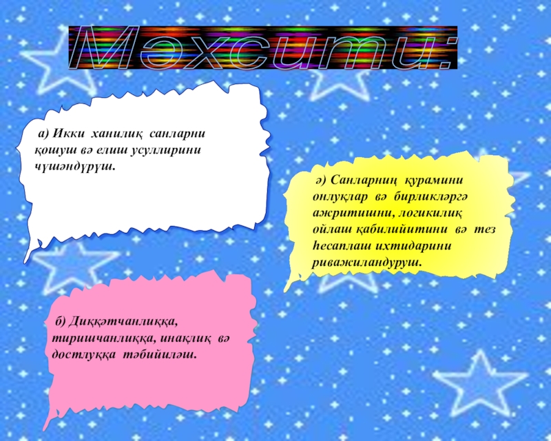ә) Санларниң қурамини онлуқлар вә бирликләргә ажритишни, логикилиқ ойлаш қабилийитини вә тез һесаплаш ихтидарини риважиландуруш.