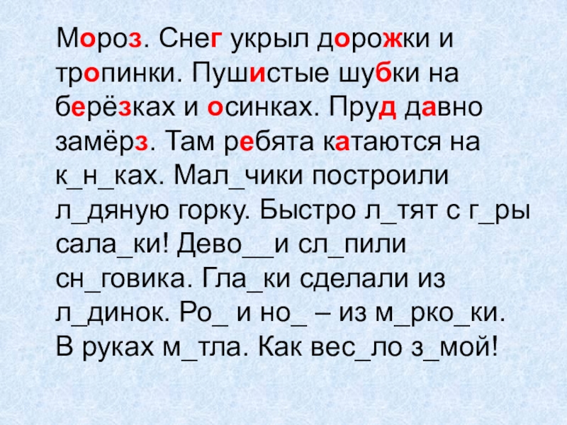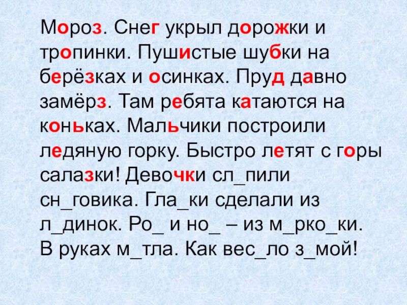 Слайд 5Мороз. Снег укрыл д_ро_ки и тр_пинки. Пуш_стые шу_ки на б_рё_ках и