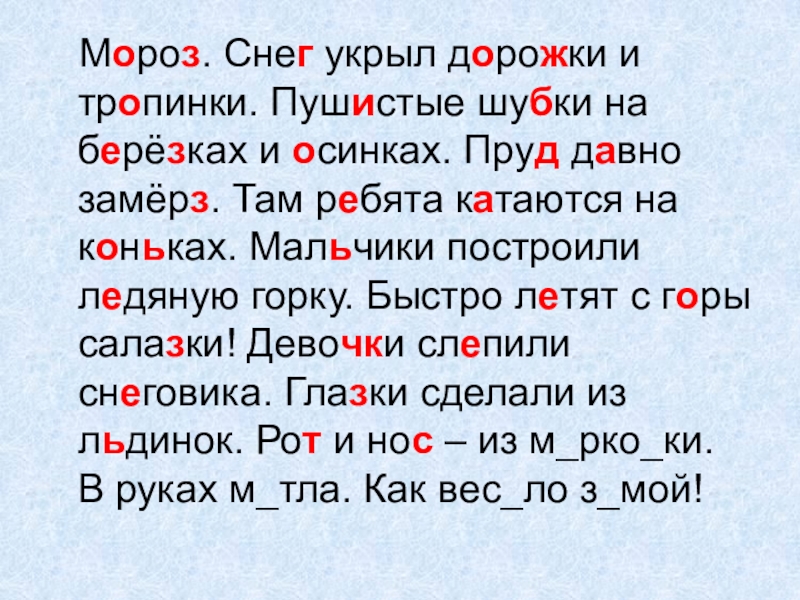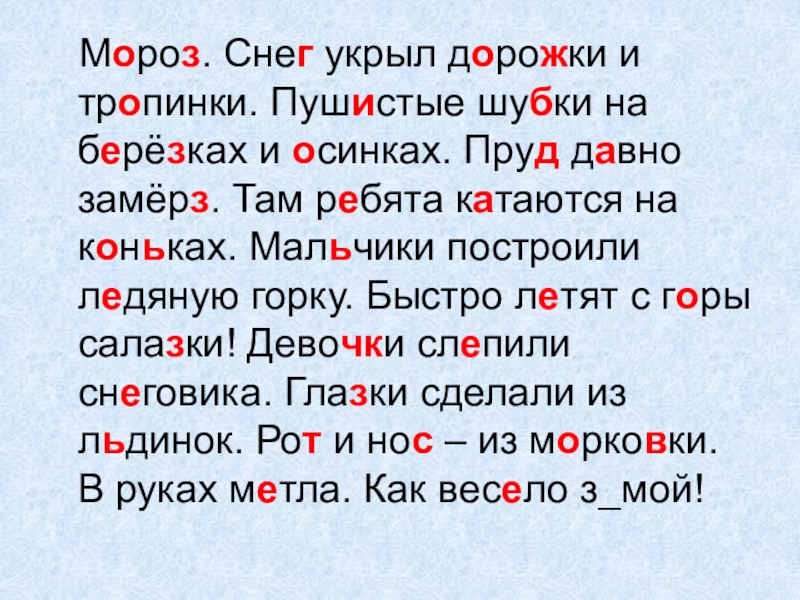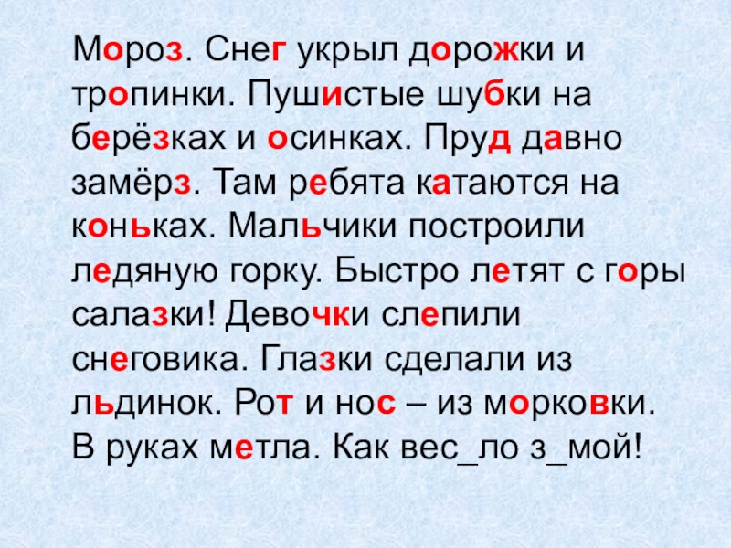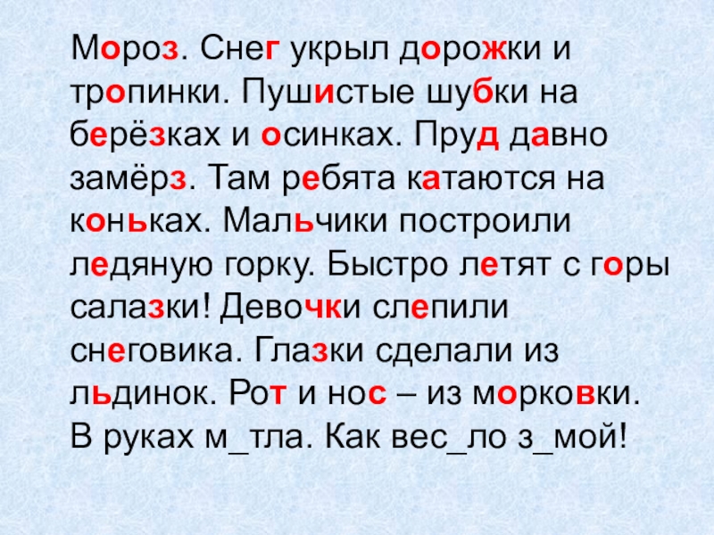 осинках. Пруд давно замёрз. Там ребята катаются на коньках. Мальчики построили ледяную горку. Быстро летят с горы салазки! Девочки сл_пили сн_говика. Гла_ки сделали из л_динок. Ро_ и но_ – из м_рко_ки. В руках м_тла. Как вес_ло з_мой!