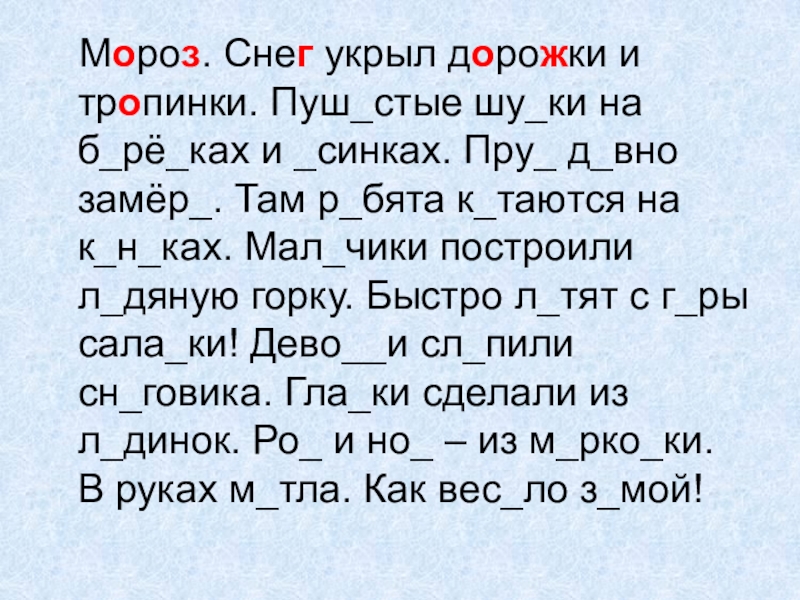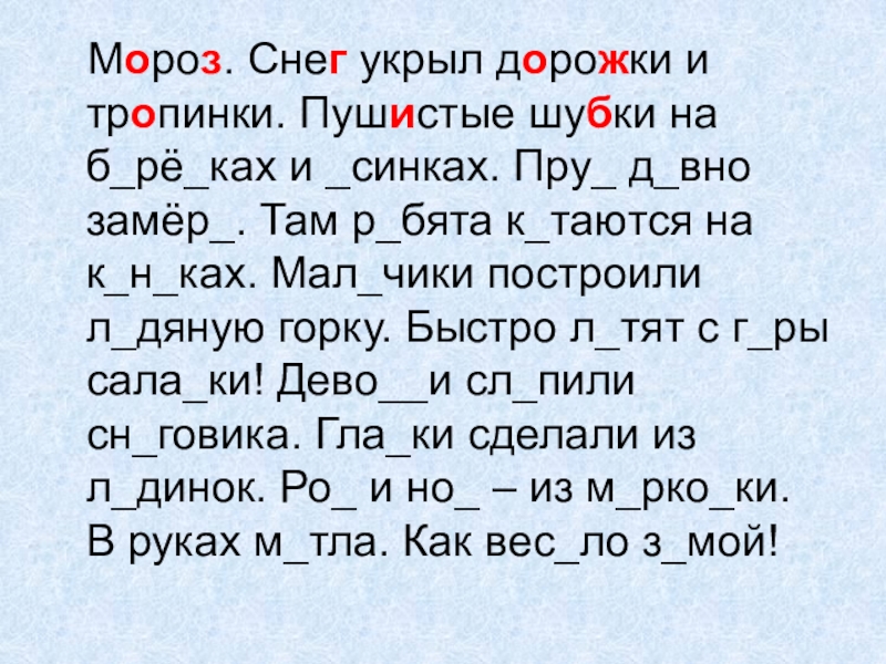 Слайд 6Мороз. Снег укрыл дорожки и тр_пинки. Пуш_стые шу_ки на б_рё_ках и