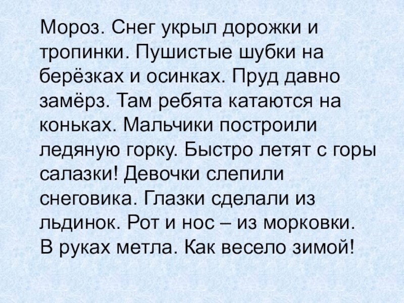 осинках. Пруд давно замёрз. Там ребята катаются на коньках. Мальчики построили ледяную горку. Быстро летят с горы салазки! Девочки слепили снеговика. Глазки сделали из льдинок. Рот и нос – из морковки. В руках метла. Как весело зимой!