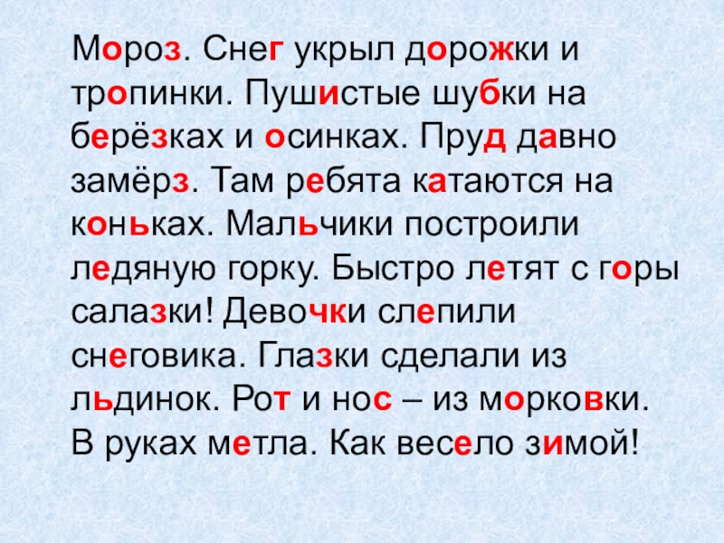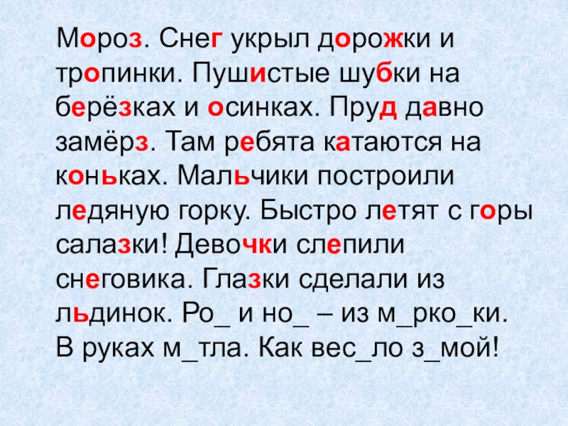 _синках. Пру_ д_вно замёр_. Там р_бята к_таются на к_н_ках. Мал_чики построили л_дяную горку. Быстро л_тят с г_ры сала_ки! Дево__и сл_пили сн_говика. Гла_ки сделали из л_динок. Ро_ и но_ – из м_рко_ки. В руках м_тла. Как вес_ло з_мой!