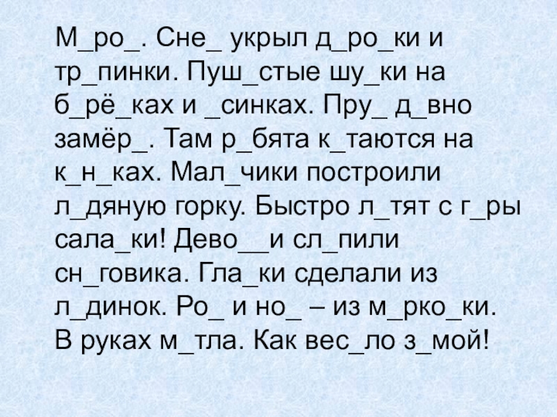 Слайд 34М_ро_. Сне_ укрыл д_ро_ки и тр_пинки. Пуш_стые шу_ки на б_рё_ках и