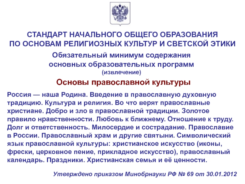 Утверждено приказом Минобрнауки РФ № 69 от 30.01.2012