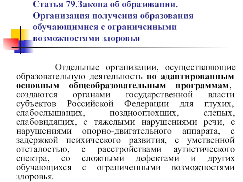 Отдельные организации, осуществляющие образовательную деятельность по адаптированным основным общеобразовательным программам, создаются органами государственной власти субъектов Российской Федерации для глухих, слабослышащих, позднооглохших, слепых, слабовидящих, с тяжелыми нарушениями речи, с нарушениями опорно-двигательного аппарата, с задержкой психического развития, с умственной отсталостью, с расстройствами аутистического спектра, со сложными дефектами и других обучающихся с ограниченными возможностями здоровья.