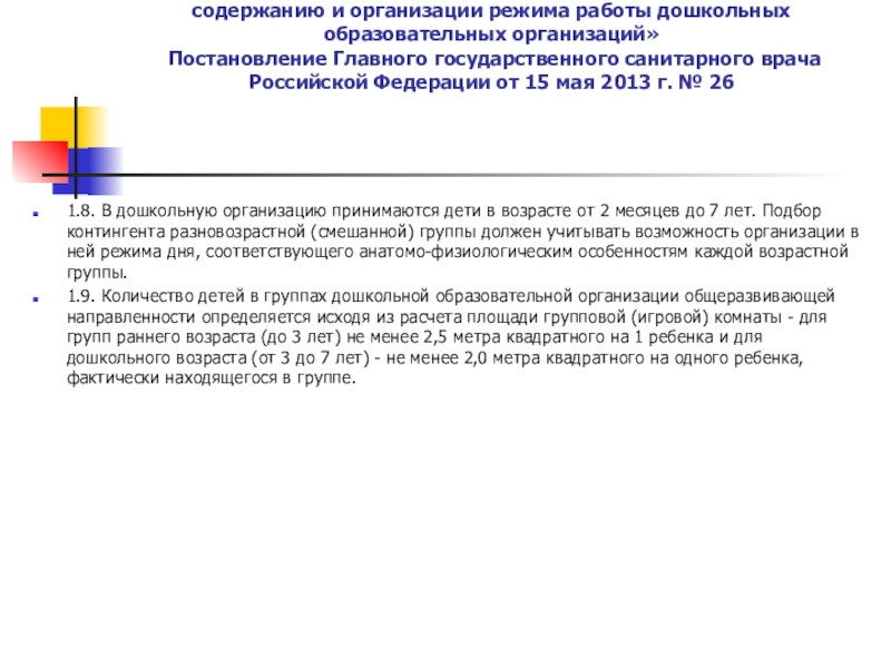 1.9. Количество детей в группах дошкольной образовательной организации общеразвивающей направленности определяется исходя из расчета площади групповой (игровой) комнаты - для групп раннего возраста (до 3 лет) не менее 2,5 метра квадратного на 1 ребенка и для дошкольного возраста (от 3 до 7 лет) - не менее 2,0 метра квадратного на одного ребенка, фактически находящегося в группе.