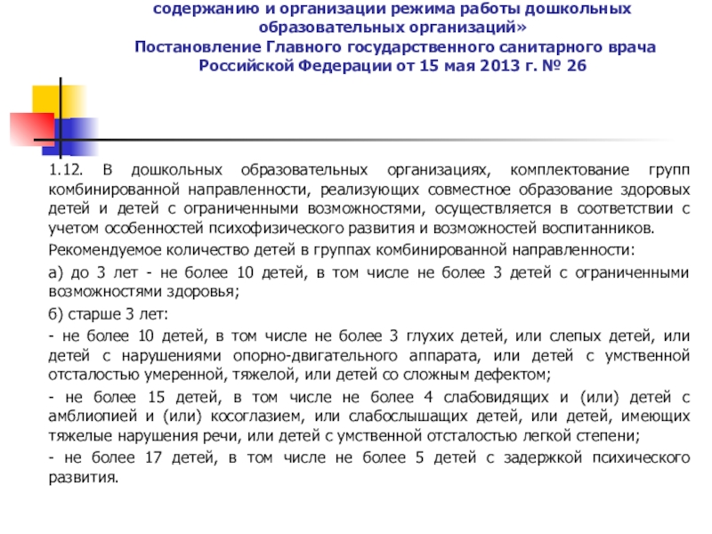 1.12. В дошкольных образовательных организациях, комплектование групп комбинированной направленности, реализующих совместное образование здоровых детей и детей с ограниченными возможностями, осуществляется в соответствии с учетом особенностей психофизического развития и возможностей воспитанников.