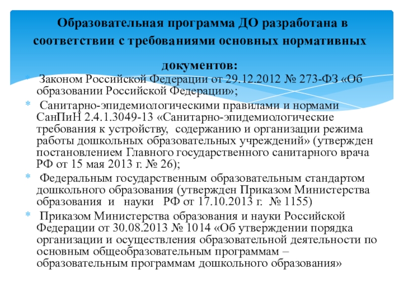 Образовательная программа ДО разработана в соответствии с требованиями основных нормативных документов: