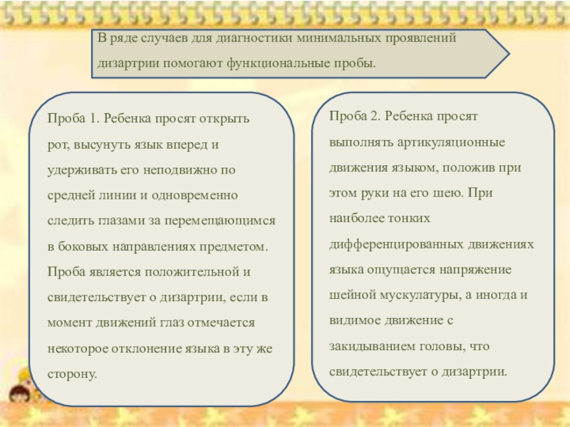 Проба 2. Ребенка просят выполнять артикуляционные движения языком, положив при этом руки на его шею. При наиболее тонких дифференцированных движениях языка ощущается напряжение шейной мускулатуры, а иногда и видимое движение с закидыванием головы, что свидетельствует о дизартрии.