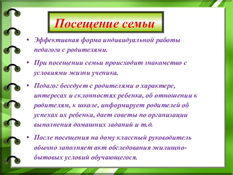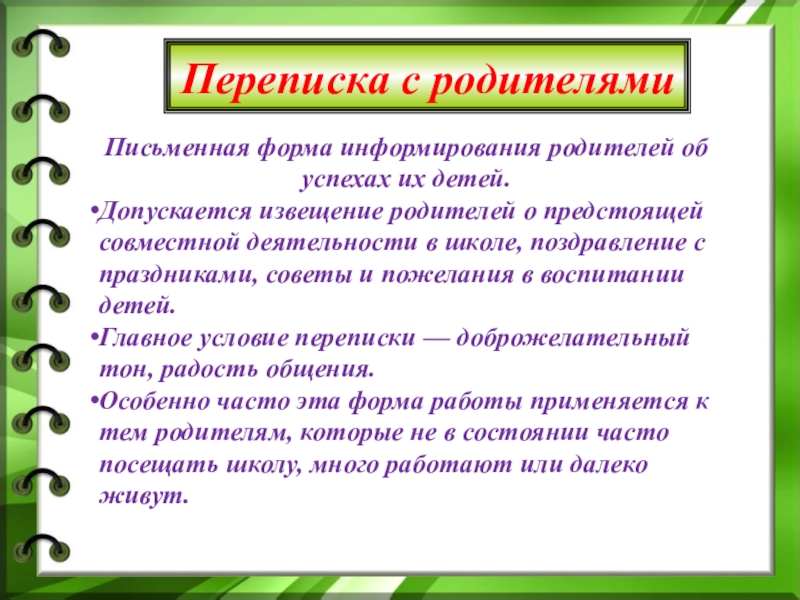 Особенно часто эта форма работы применяется к тем родителям, которые не в состоянии часто посещать школу, много работают или далеко живут.