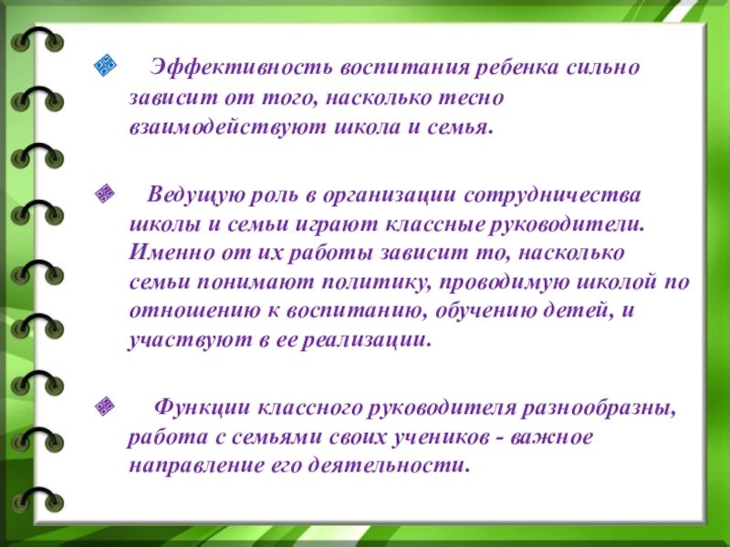 Ведущую роль в организации сотрудничества школы и семьи играют классные руководители. Именно от их работы зависит то, насколько семьи понимают политику, проводимую школой по отношению к воспитанию, обучению детей, и участвуют в ее реализации.