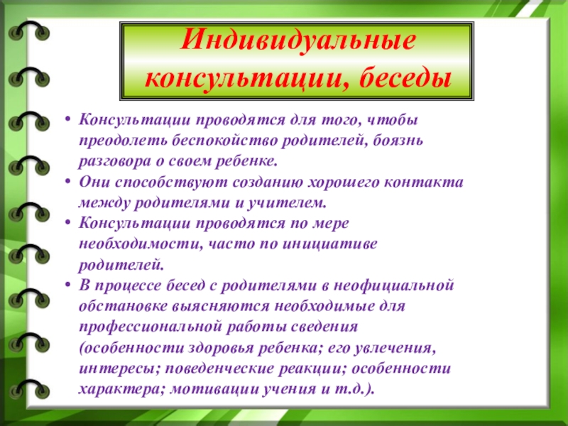 Педагог беседует с родителями о характере, интересах и склонностях ребенка, об отношении к родителям, к школе, информирует родителей об успехах их ребенка, дает советы по организации выполнения домашних заданий и т.д.
