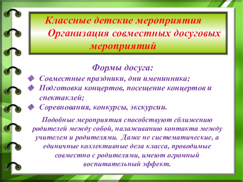 Подобные мероприятия способствуют сближению родителей между собой, налаживанию контакта между учителем и родителями. Даже не систематические, а единичные коллективные дела класса, проводимые совместно с родителями, имеют огромный воспитательный эффект.
