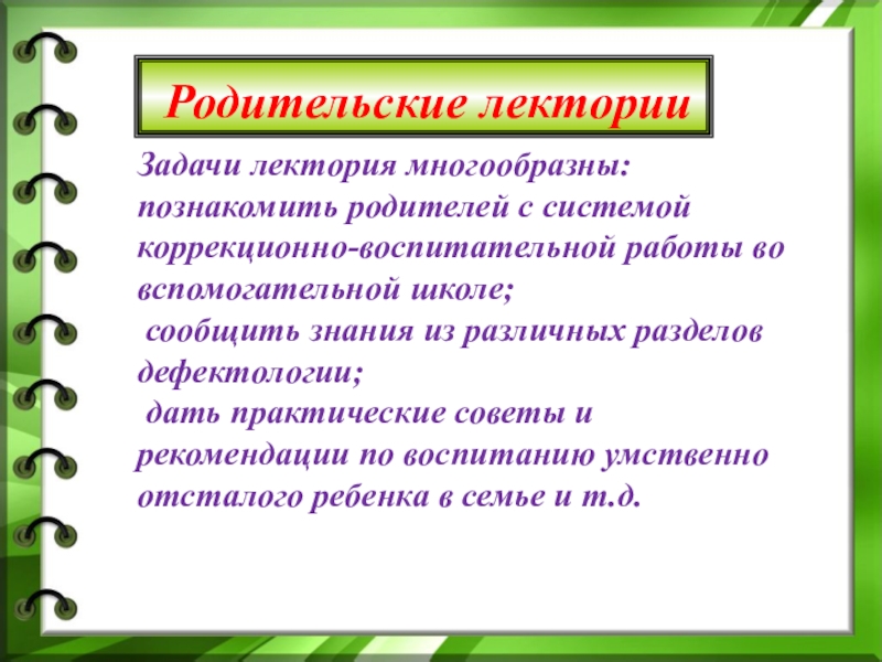 Задачи лектория многообразны: познакомить родителей с системой коррекционно-воспитательной работы