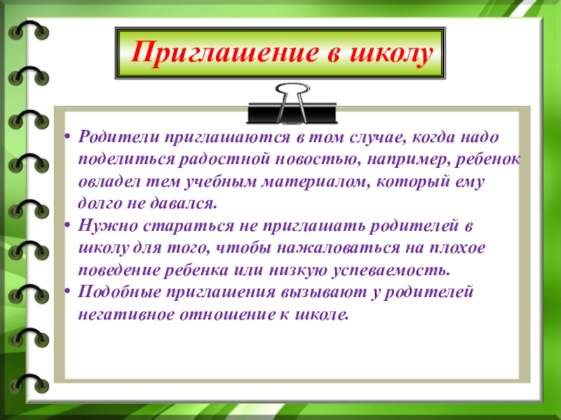 Нужно стараться не приглашать родителей в школу для того, чтобы нажаловаться на плохое поведение ребенка или низкую успеваемость.