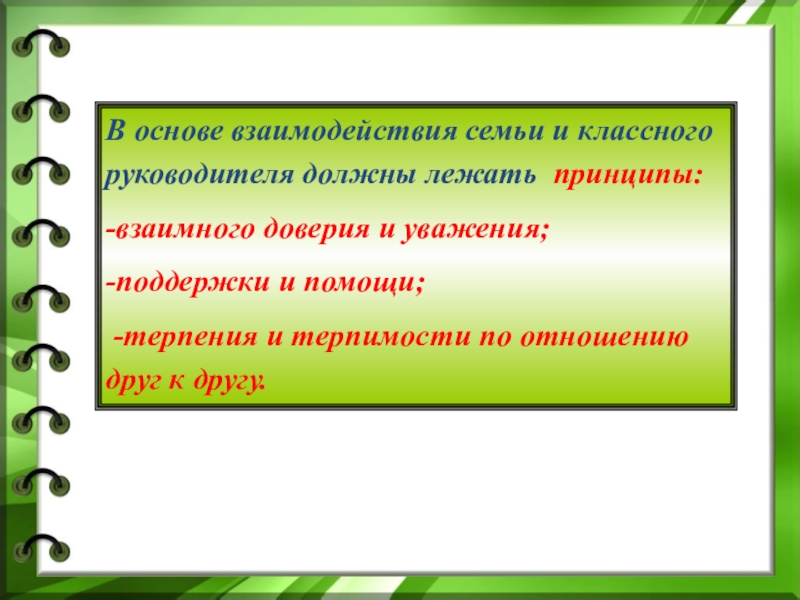 Слайд 7В основе взаимодействия семьи и классного руководителя должны лежать принципы:
