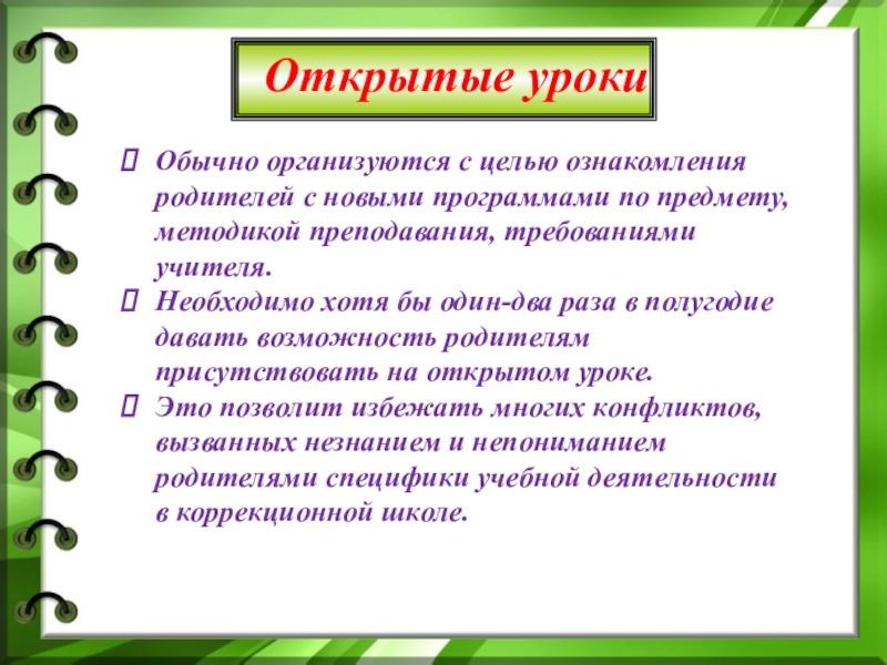 Необходимо хотя бы один-два раза в полугодие давать возможность родителям присутствовать на открытом уроке.