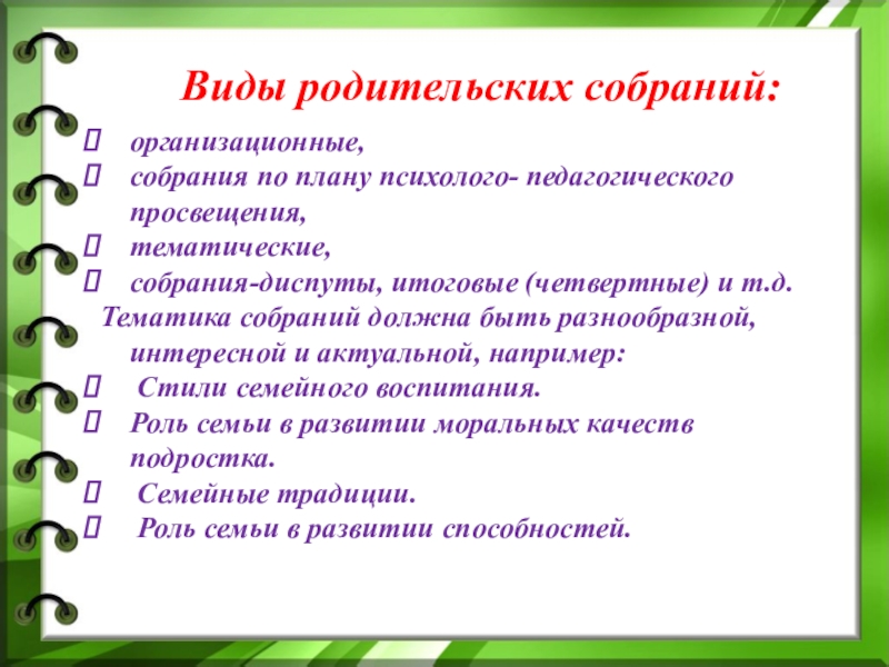 Слайд 23Виды родительских собраний: