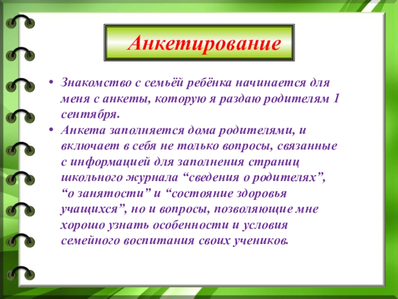 Анкета заполняется дома родителями, и включает в себя не только вопросы, связанные с информацией для заполнения страниц школьного журнала “сведения о родителях”, “о занятости” и “состояние здоровья учащихся”, но и вопросы, позволяющие мне хорошо узнать особенности и условия семейного воспитания своих учеников.