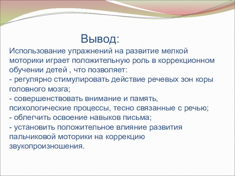 Вывод: Использование упражнений на развитие мелкой моторики играет положительную роль в коррекционном обучении детей , что позволяет: - регулярно стимулировать действие речевых зон коры головного мозга; - совершенствовать внимание и память,психологические процессы, тесно связанные с речью; - облегчить освоение навыков письма; - установить положительное влияние развития пальчиковой моторики на коррекцию звукопроизношения.