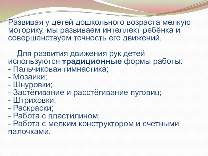 Слайд 4Развивая у детей дошкольного возраста мелкую моторику, мы развиваем интеллект ребёнка