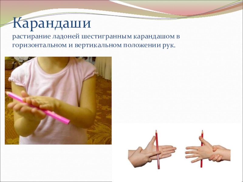 Слайд 15Карандаши растирание ладоней шестигранным карандашом в горизонтальном и вертикальном положении рук.