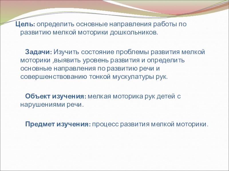 Цель: определить основные направления работы по развитию мелкой моторики дошкольников.	Задачи: Изучить состояние проблемы развития мелкой моторики