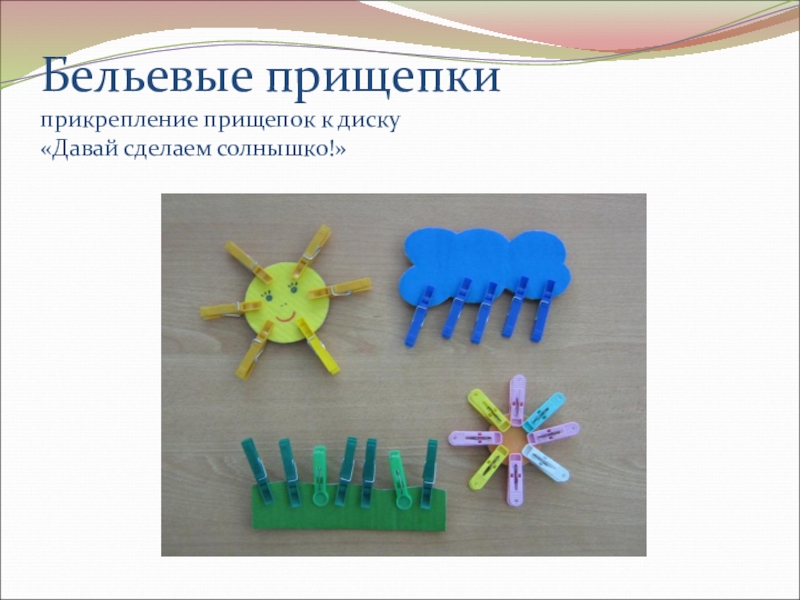 Слайд 16Бельевые прищепки прикрепление прищепок к диску «Давай сделаем солнышко!»