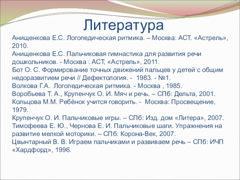Литература Анищенкова Е.С. Логопедическая ритмика. – Москва: АСТ. «Астрель», 2010. Анищенкова Е.С. Пальчиковая гимнастика для развития речи дошкольников. - Москва : АСТ, «Астрель», 2011. Бот О. С. Формирование точных движений пальцев у детей с общим недоразвитием речи // Дефектология. -  1983. - №1. Волкова Г.А. Логопедическая ритмика. - Москва , 1985. Воробьева Т. А., Крупенчук О. И. Мяч и речь. – СПб: Дельта, 2001. Кольцова М.М. Ребёнок учится говорить. - Москва: Просвещение, 1979. Крупенчук О. И. Пальчиковые игры. – СПб: Изд. дом «Литера», 2007. Тимофеева Е. Ю., Чернова Е. И. Пальчиковые шаги. Упражнения на развитие мелкой моторики. – СПб: Корона-Век, 2007. Цвынтарный В. В. Играем пальчиками и развиваем речь – СПб: ИЧП «Хардфорд», 1996.