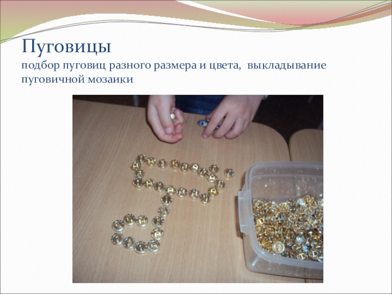 Слайд 14Пуговицы подбор пуговиц разного размера и цвета, выкладывание пуговичной мозаики