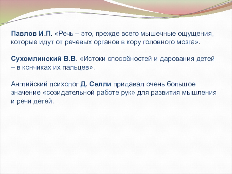 Павлов И.П. «Речь – это, прежде всего мышечные ощущения, которые идут от речевых органов в кору головного мозга». Сухомлинский В.В. «Истоки