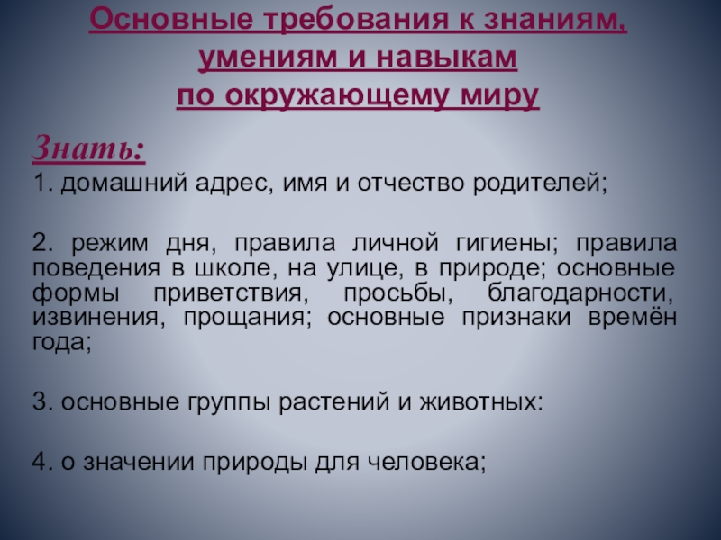 2. режим дня, правила личной гигиены; правила поведения в школе, на улице, в природе; основные формы приветствия, просьбы, благодарности, извинения, прощания; основные признаки времён года;
