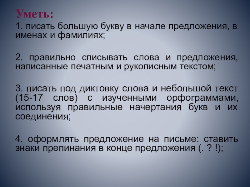 4. оформлять предложение на письме: ставить знаки препинания в конце предложения (. ? !);