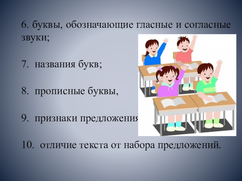 6. буквы, обозначающие гласные и согласные звуки;