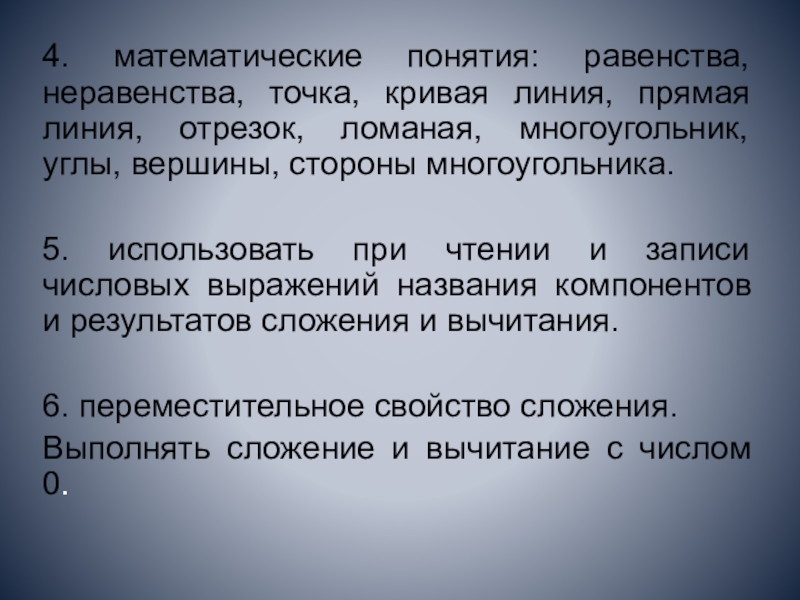 Слайд 114. математические понятия: равенства, неравенства, точка, кривая линия, прямая линия, отрезок,