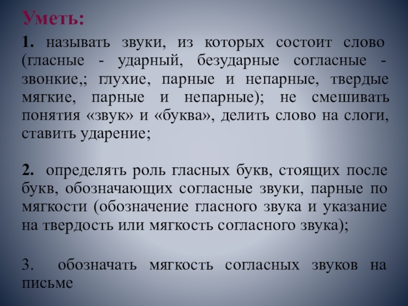 согласные - звонкие,; глухие, парные и непарные, твердые мягкие, парные и непарные); не смешивать понятия «звук» и «буква», делить слово на слоги, ставить ударение;