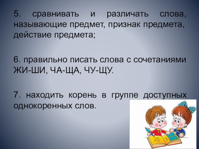 Слайд 95. сравнивать и различать слова, называющие предмет, признак предмета, действие предмета;