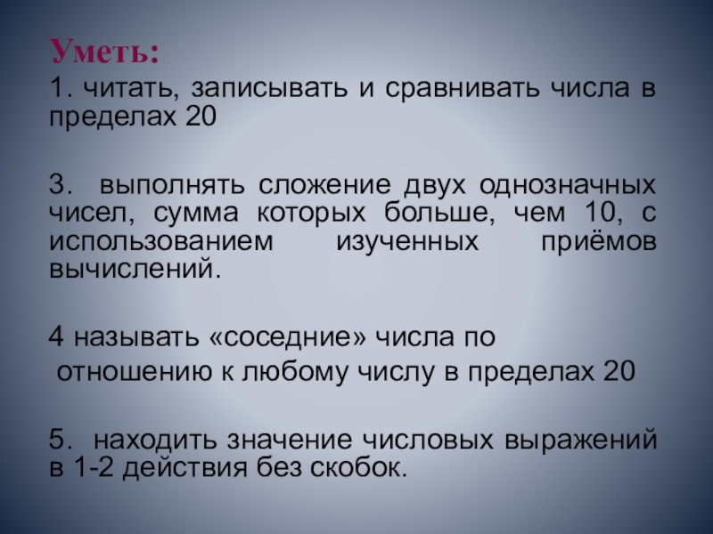 1. читать, записывать и сравнивать числа в пределах 20