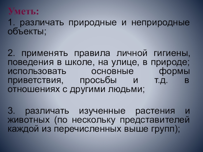 1. различать природные и неприродные объекты;