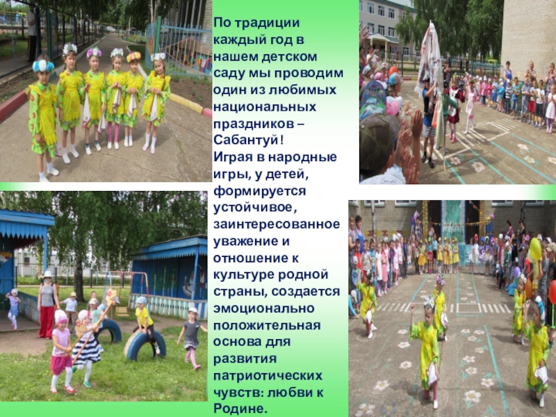 из любимых национальных праздников – Сабантуй! Играя в народные игры, у детей, формируется устойчивое, заинтересованное уважение и отношение к культуре родной страны, создается эмоционально положительная основа для развития патриотических чувств: любви к Родине.