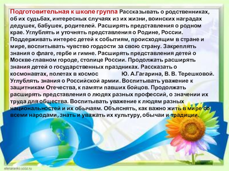 случаях из их жизни, воинских наградах дедушек, бабушек, родителей. Расширять представления о родном крае. Углублять и уточнять представления о Родине, России. Поддерживать интерес детей к событиям, происходящим в стране и мире, воспитывать чувство гордости за свою страну. Закреплять знания о флаге, гербе и гимне. Расширять представления детей о Москве-главном городе, столице России. Продолжать расширять знания детей о государственных праздниках. Рассказать о космонавтах, полетах в космос Ю. А.Гагарина, В. В. Терешковой. Углублять знания о Российской армии. Воспитывать уважение к защитникам Отечества, к памяти павших бойцов. Продолжать расширять представления о людях разных профессий, о значении их труда для общества. Воспитывать уважение к людям разных национальностей и их обычаям. Объяснять, как важно жить в мире со всеми народами, знать и уважать их культуру, обычаи и традиции.