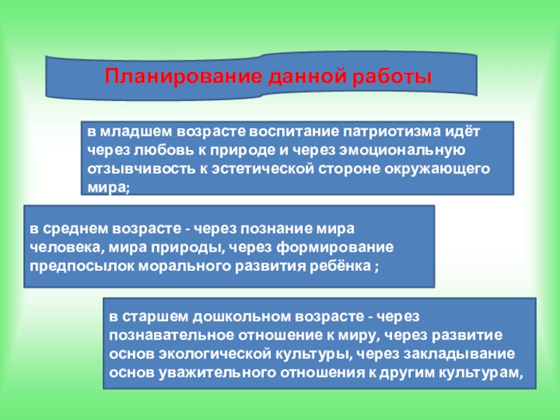 В старшем дошкольном возрасте через познавательное отношение к миру, через развитие основ экологической культуры, через закладывание основ уважительного отношения к другим культурам, через позицию созидателя и творца, через эмоциональную отзывчивость к эстетической стороне окружающей действительности.