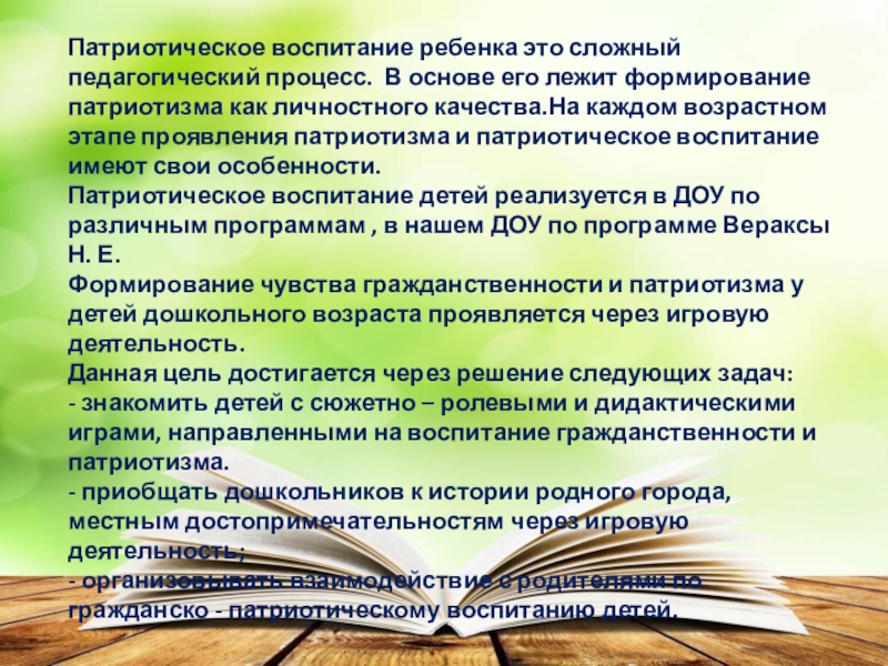 Слайд 22Патриотическое воспитание ребенка это сложный педагогический процесс. В основе его лежит