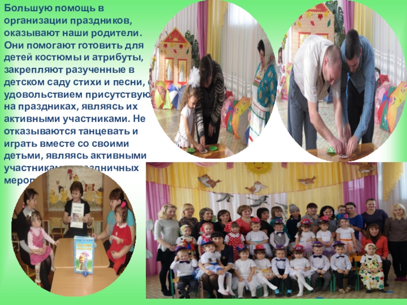 Слайд 30Большую помощь в организации праздников, оказывают наши родители. Они помогают готовить