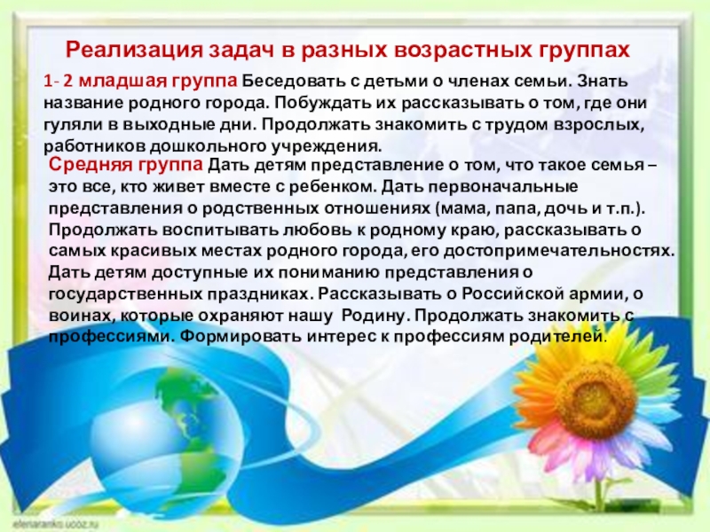 Средняя группа Дать детям представление о том, что такое семья – это все, кто живет вместе с ребенком. Дать первоначальные представления о родственных отношениях (мама, папа, дочь и т.п.). Продолжать воспитывать любовь к родному краю, рассказывать о самых красивых местах родного города, его достопримечательностях. Дать детям доступные их пониманию представления о государственных праздниках. Рассказывать о Российской армии, о воинах, которые охраняют нашу Родину. Продолжать знакомить с профессиями. Формировать интерес к профессиям родителей.