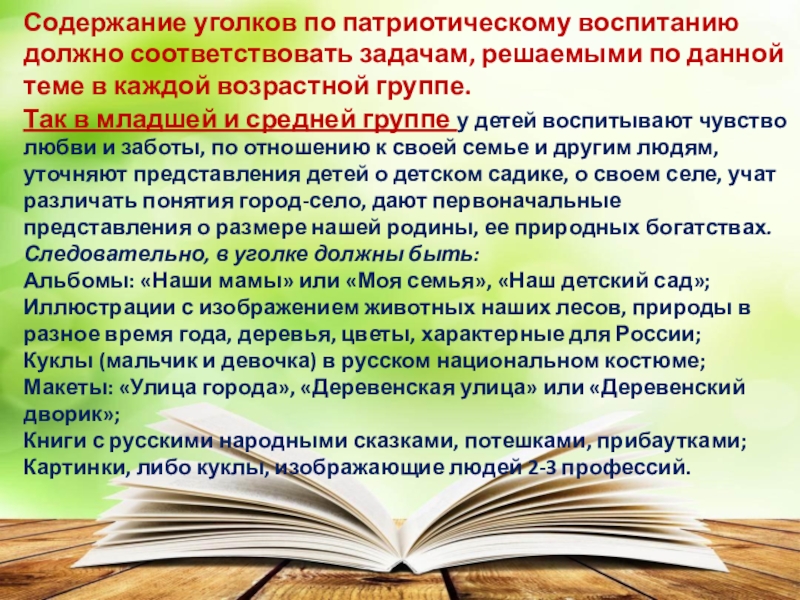 Слайд 23Содержание уголков по патриотическому воспитанию должно соответствовать задачам, решаемыми по данной