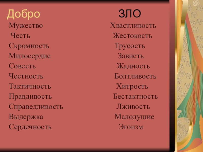 Мужество, честь, хвастливость, жестокость, скромность, милосердие, совесть трусость, зависть, жадность, честность, тактичность, болтливость, правдивость, хитрость, бестактность, лживость, малодушие, справедливость, выдержка, эгоизм, сердечность.