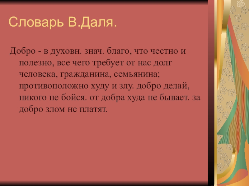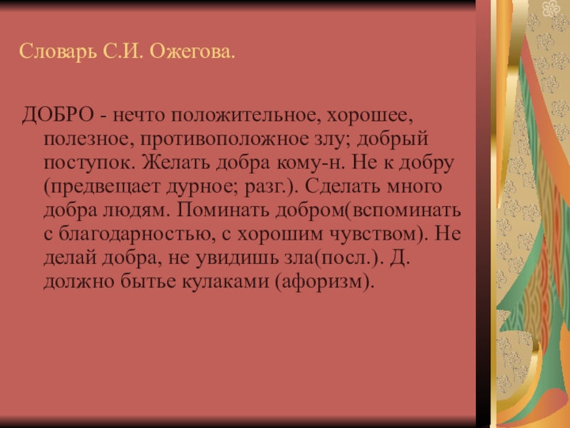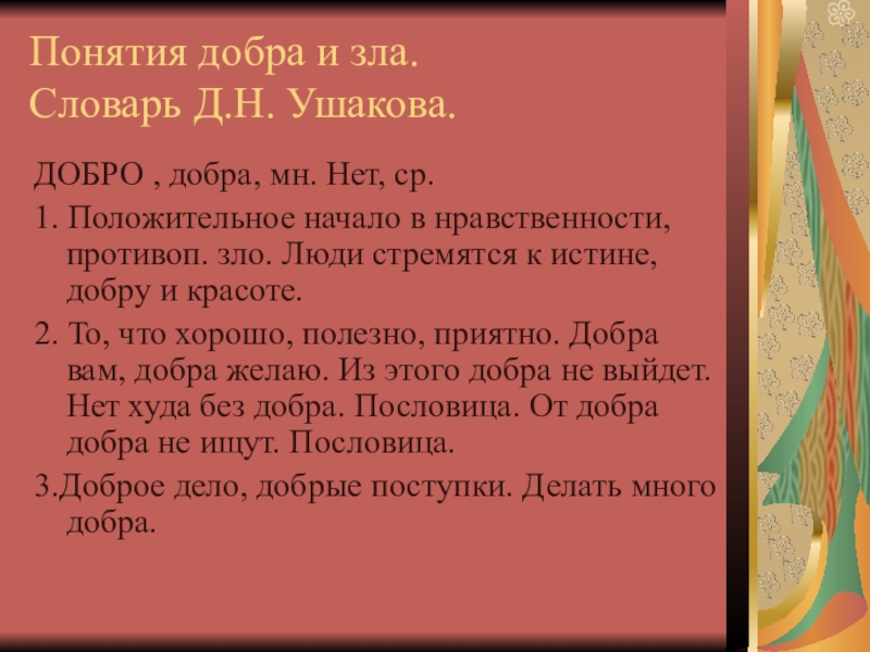 ДОБРО - нечто положительное, хорошее, полезное, противоположное злу; добрый